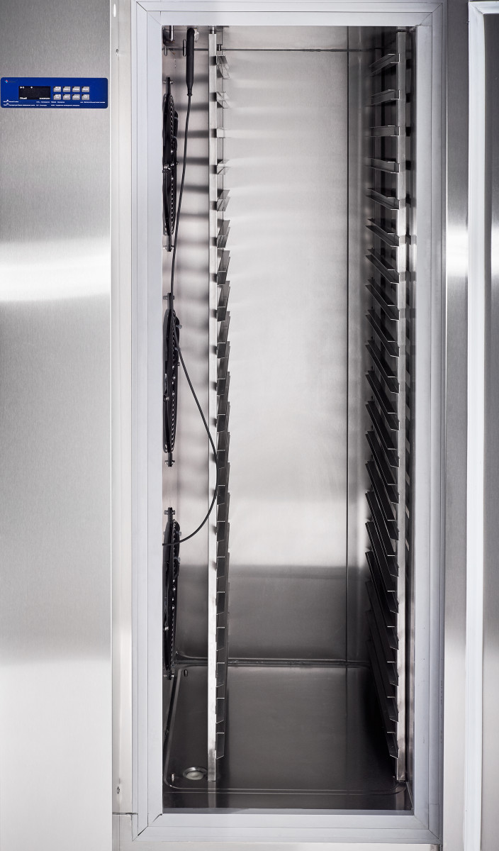 С максимальной вместимостью 400 литров, шкаф предлагает 20 уровней для гастроемкостей формата GN 1/1 или противней размером 600х400 мм. Для перехода на использование противней достаточно переустановить левую направляющую. Устройство функционирует при входящей температуре продуктов до 90 °C, а его охлаждение происходит до 3 °C за 90 минут. Заморозка осуществляется до -18 °C в течение 240 минут, что позволяет сохранить все питательные вещества и вкусовые качества продуктов.