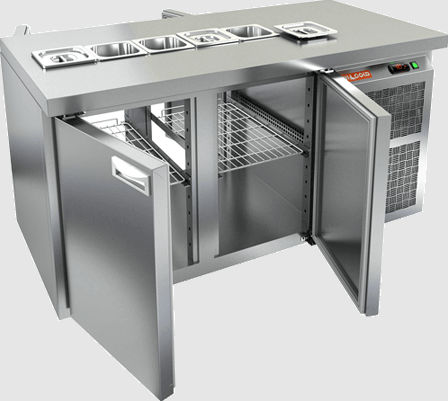 что значительно упрощает эксплуатацию. Электронная панель управления обеспечивает точный контроль за температурными режимами. Стол также укомплектован двумя полками, каждая из которых имеет размеры 530х325 мм (стандарт GN 1/1), и может вместить до 5 контейнеров GN1/6. Регулируемые ножки по высоте, автоматические доводчики дверей с фиксатором открытого положения и легко заменяемые магнитные уплотнители делают использование стола еще более удобным.