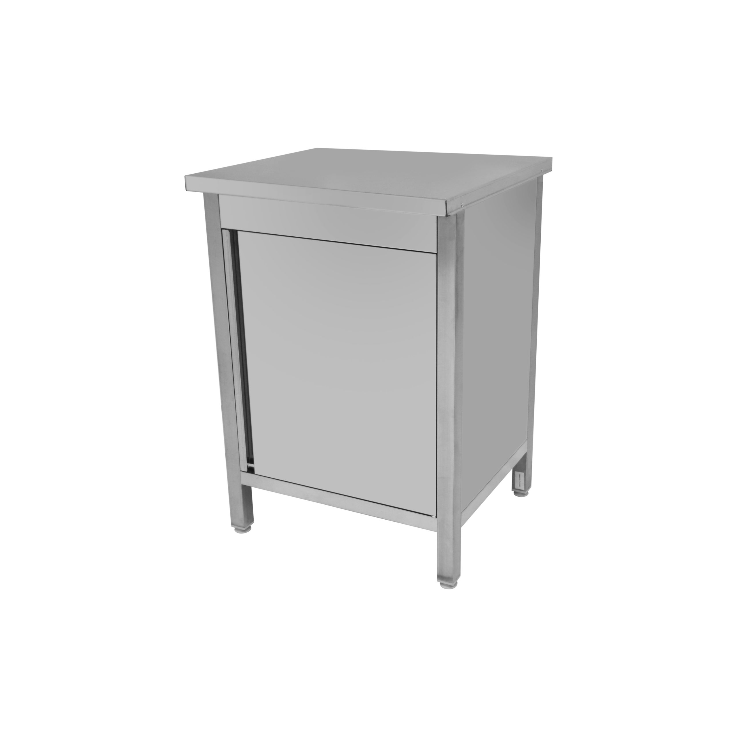 Стол имеет прямоугольную столешницу без борта, выполненную из пищевой нержавеющей стали AISI 430, которая дополнительно укреплена древесно-стружечной плитой с внутренней стороны. Это обеспечивает высокую прочность и предотвращает прогиб столешницы. Конструкция включает среднюю полку и каркас, изготовленные из крашенной или нержавеющей стали. Все края столешницы обработаны, а углы заварены и зашлифованы, что исключает риск травм при использовании и санитарной обработке.