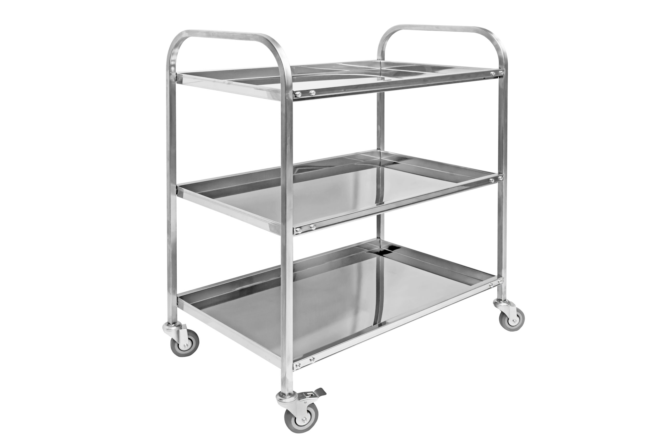 Конструкция тележки включает опорные дуги, изготовленные из нержавеющего квадратного профиля размером 20х20 мм, и три поддона, выполненные из пищевой нержавеющей стали AISI 430. Тележка оснащена четырьмя поворотными колесами, одно из которых имеет тормоз для повышения безопасности.