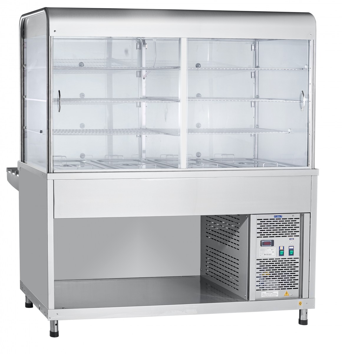 Данная витрина предназначена для временного хранения, демонстрации и сервировки холодных закусок и вторых блюд. Она может использоваться как в составе технологических линий раздачи, так и в качестве самостоятельного элемента. Витрина функционирует в условиях окружающей температуры от 12 до 32°C и относительной влажности от 40 до 70%. Климатический класс изделия соответствует 4 (tов=30°C / 55%).