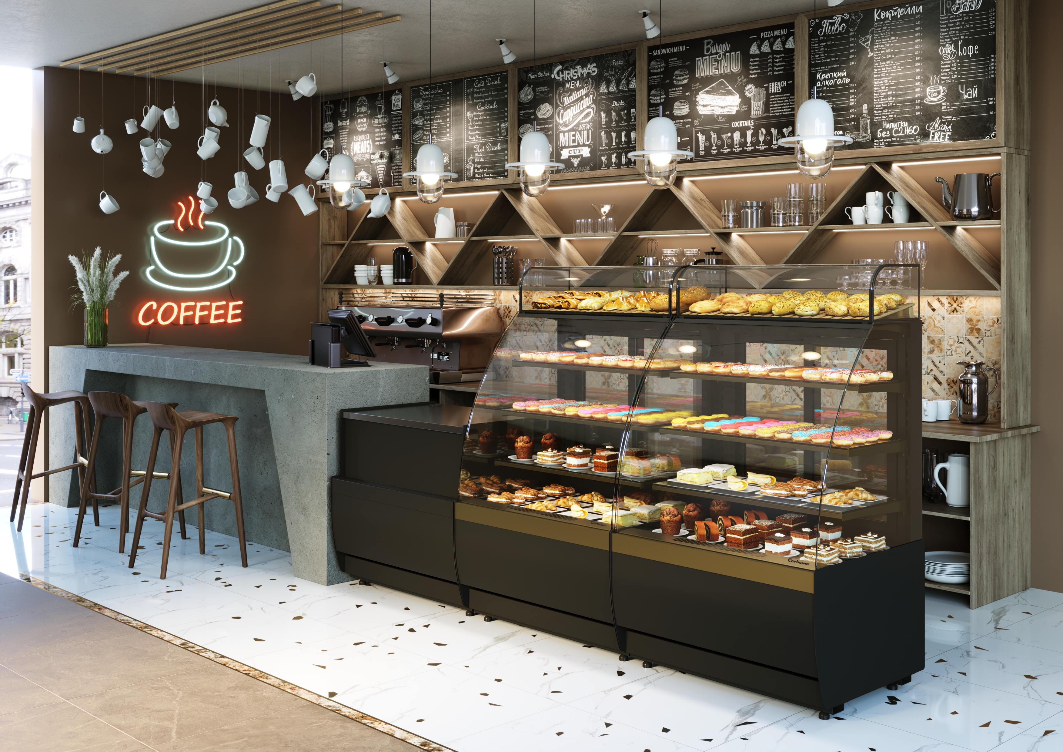 Боковые стеклопакеты открываются, а задние створки-слайдеры с встроенной ручкой обеспечивают удобный доступ к продуктам. Витрина также включает три полки с LED-подсветкой, что придаёт дополнительный шарм выставленным изделиям.